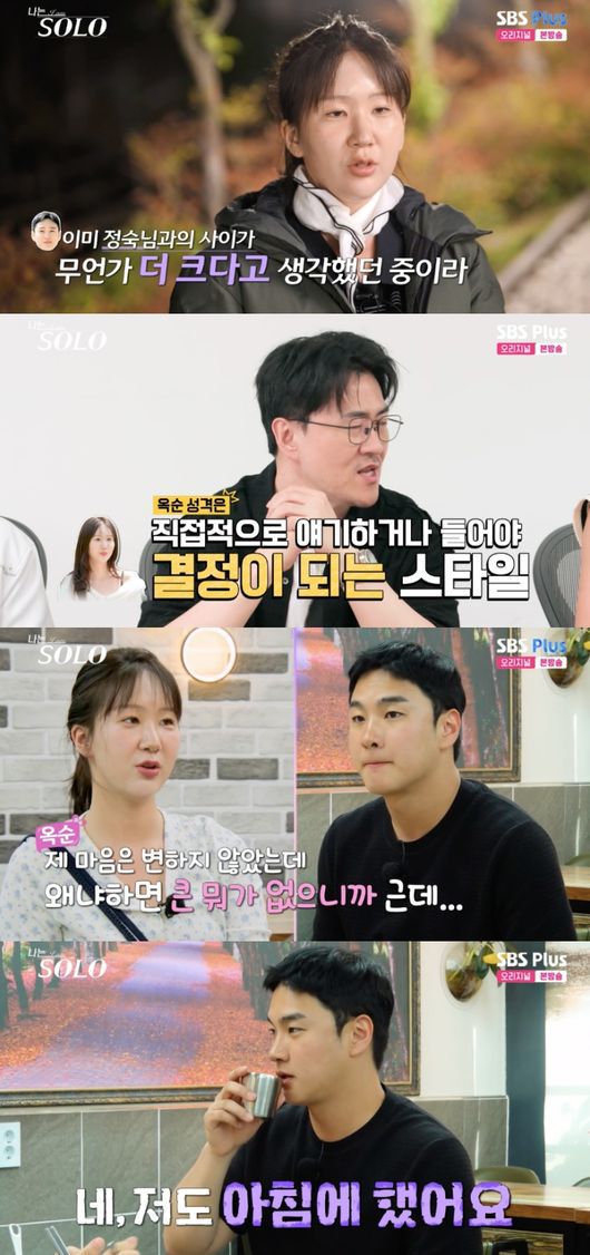 이를 눈치챈 정숙은 인터뷰를 통해 “나한테 은근히 느껴지는 미안해하는 감정과 옥순님에게 쏠리는 그 관심. 처음에는 뭐지? 그러다가 옥순님이 머리를 묶었는데 묶은거랑 푼 거랑 느낌 다르다고 들었을 때 머리 묶고 푼 차이를 알아보는 것 자체가 관심이다. 다르다고느낀 것도 관심이다. 점점 깨달아가면서 허탈한 것도 있다”라며 “내가 왜 눈치를 못 챘지, 나 자신에게도 실망”이라고 털어놨다.