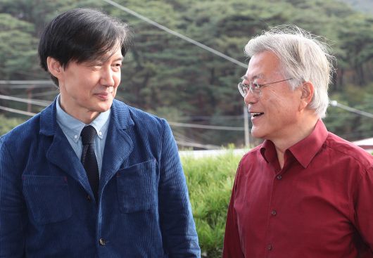 지난 2023년 11월 9일 조국 전 법무부 장관이 경남 양산시 하북면 평산책방에서 열린 '디케의 눈물' 작가 사인회에서 문재인 전 대통령과 대화를 하고 있다./뉴스1 |