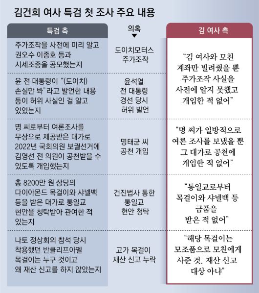 첫 순서로 진행된 도이치모터스 주가조작 의혹 조사에서 특검은 김 여사가 사전에 주가조작 가능성을 인지하고 있었는지 등에 대해 캐물은 것으로 전해졌다. 주가조작 핵심 인물 김모 씨는 지난해 서울중앙지검 수사 당시 “권오수 전 도이치 회장과 이종호 전 블랙펄인베스트 대표, 김 여사가 패밀리로 묶여서 활동했다”고 진술했다. 김 여사는 “단순히 계좌를 빌려줬을 뿐 주가조작은 몰랐다” “주가조작을 공모한 바 없다”는 취지로 혐의를 부인했다고 한다.