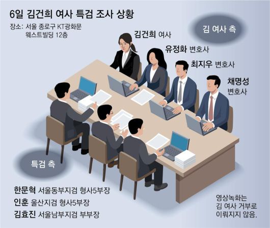 특검은 이날 김 여사를 ‘피의자’라고 부르며 조사했다고 한다. 문홍주 특검보는 조사가 진행 중이던 이날 오후 3시경 브리핑을 열고 “(김 여사에 대한) 호칭은 피의자로 해 조사하고 있다”며 “출석 요구서에 넣었던 피의사실 위주로 조사하고 있다”고 밝혔다. 이날 조사는 2009∼2012년 무렵 벌어졌던 도이치모터스 주가조작 의혹 사건부터 2022년 윤석열 전 대통령 당선 전후에 벌어진 명태균 씨 등의 공천 개입 의혹, 건진법사 전성배 씨를 통한 각종 이권 및 현안 청탁 의혹 순으로 진행됐다. 특검에서는 한문혁 서울동부지검 형사5부장검사(사법연수원 36기) 등 앞서 검찰 단계에서부터 해당 의혹을 수사해 온 베테랑 검사들이 직접 신문에 나선 것으로 전해졌다.