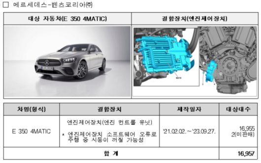 벤츠 E 350 4MATIC 차종 1만6957대는 엔진제어장치 소프트웨어 오류, EQE 350 4MATIC 등 5개 차종 523대는 고전압배터리 관리시스템 소프트웨어 오류로 인해 시동이 꺼질 가능성이 각각 발견돼 지난달 25일부터 시정조치를 진행하고 있다.