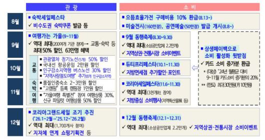 기존의 ‘동행축제’, ‘코리아세일페스타’는 참여 업체를 확대해 역대 최대 규모로 운영되며, ‘코리아그랜드세일’은 한 달 앞당겨 시행된다. 또한 ‘듀티프리페스타’는 최장 기간인 61일간 열린다.