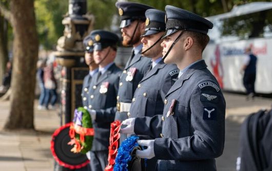 지난 2024년 9월15일 ‘영국 전투의 날’을 맞아 영국 공군 장병들이 제2차 세계대전 기념비에 바칠 화환을 들고 서 있다. ‘영국 전투의 날’은 2차대전 초반 영국 상공에서 벌어진 영국 공군과 독일 공군 간의 공중전에서 영국이 승리한 것을 기리고자 1943년 제정됐다. 영국 공군 홈페이지 |