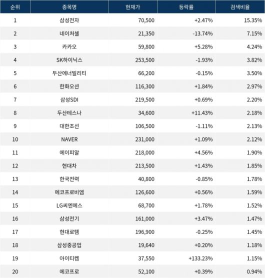 이어 네이처셀(007390)이 검색비율 2위를 기록하며 13.74%의 하락세를 기록하고 있다. 검색비율 3위의 카카오(035720)는 5.28% 상승하며 순조롭게 출발하는 모습이다. 검색비율 4위 SK하이닉스(000660)는 개장 초반부터 1.93%의 하락률을 보이고 있다. 검색비율 5위 두산에너빌리티(034020)는 0.15% 하락하며 큰 움직임을 보이지 않고 있다.
