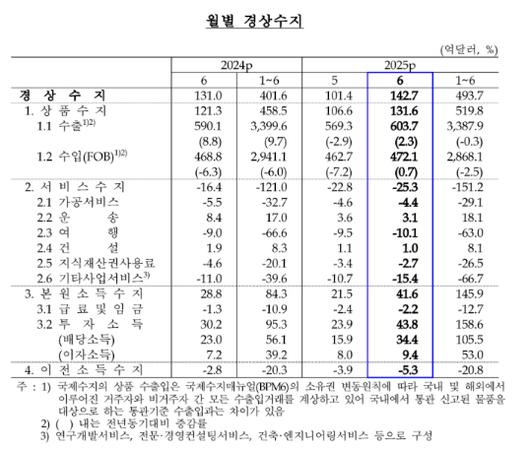 한국은행이 7일 발표한 국제수지 잠정 통계에 따르면 지난 6월 경상수지 흑자가 142억 7000만달러를 기록했다. 5월(101억 4000만 달러)과 비교해선 41억 3000만 달러 늘었다.