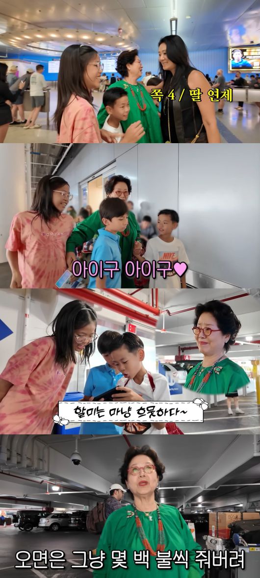 딸에게 줄 화장품 등 집에서 자녀를 위해 많은 짐을 챙겨온 선우용여는 손주들을 만나자마자 "알러뷰"를 외치며 기쁨의 포옹과 뽀뽀를 했다.