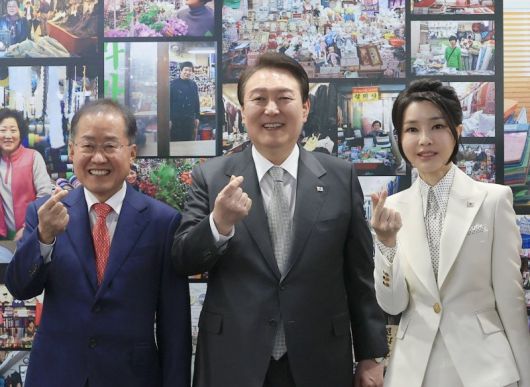 지난 2023년 4월 윤석열 당시 대통령과 부인 김건희 여사가 대구 서문시장 인근에서 열린 ‘서문시장 100주년 기념 특별사진전’을 찾아 홍준표 당시 대구시장과 기념촬영하는 모습. [대통령실] |