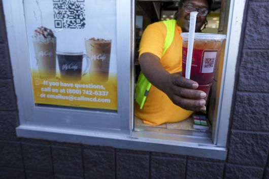 미국 텍사스주의 맥도날드 드라이브스루 매장에서 지난 5일(현지시간) 점원이 주문한 음료를 건네고 있다. [AP] |