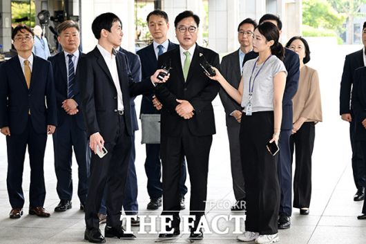 [더팩트ㅣ남용희 기자] 우원식 국회의장(가운데)이 7일 오전 서울 서초구 서울고등검찰청 청사에 마련된 내란 특검(특별검사 조은석) 사무실에 참고인 신분으로 출석하며 입장을 밝히고 있다.