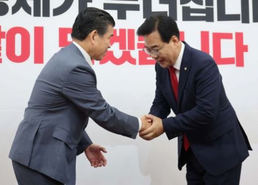 송언석 국민의힘 비상대책위원장 겸 원내대표가 7일 국회에서 제임스 김 주한미국상공회의소(AMCHAM) 회장과 만나 악수하고 있다. <ⓒ투자가를 위한 경제콘텐츠 플랫폼, 아시아경제(www.asiae.co.kr) 무단전재 배포금지>