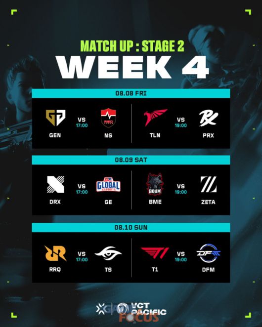 5대5 대전형 캐릭터 기반 전술 슈팅 게임 '발로란트'의 개발 및 유통사인 라이엇 게임즈(한국 대표 조혁진)는 8월 8일(금)부터 11일(일)까지 서울특별시 마포구 상암동에 위치한 SOOP 콜로세움에서 열리는 VCT 퍼시픽 스테이지 2 4주 차에서 알파조에 속한 농심 레드포스가 한 장 남은 티켓을 쟁취하기 위해 젠지와 대결을 펼친다고 밝혔다.