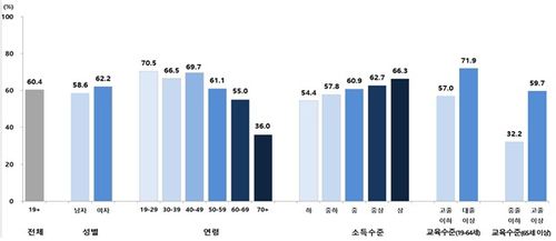 연령이 낮을수록 이해능력 수준이 높아 20대 중엔 70.5%가 적절 수준의 이해력을 갖췄지만, 70세 이상에선 그 비율이 절반인 36.0%에 그쳤다.