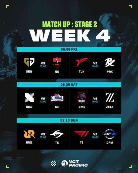 5대5 대전형 캐릭터 기반 전술 슈팅 게임 '발로란트'의 개발 및 유통사인 라이엇 게임즈는 8월 8일(금)부터 11일(일)까지 서울특별시 마포구 상암동에 위치한 SOOP 콜로세움에서 열리는 VCT 퍼시픽 스테이지 2 4주 차에서 알파조에 속한 농심 레드포스가 한 장 남은 티켓을 쟁취하기 위해 젠지와 대결을 펼친다고 밝혔다.