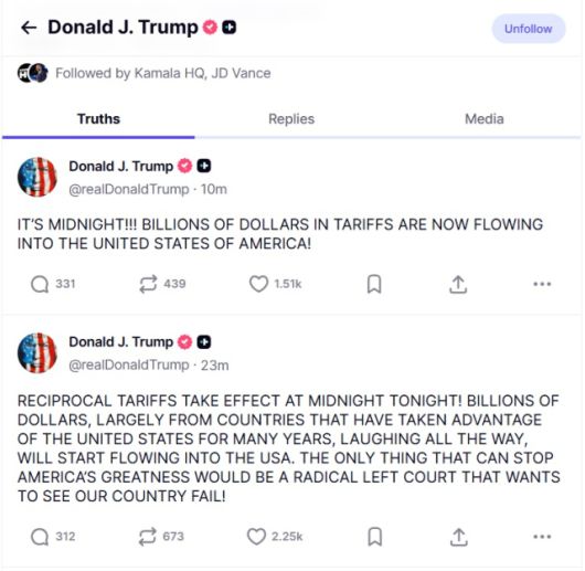 도널드 트럼프 미 대통령은 7일(현지 시간) 자정께 트루스소셜을 통해 “자정이다!!! 수십억달러의 관세가 지금 미국으로 흘러들어오고 있다"고 적었다. 또 다른 글에서는 “수십년 동안 미국을 이용해온 국가들로부터 수십억달러가 미국으로 흘러들어오기 시작할 것”이라며 “미국의 위대함을 막을 수 있는 유일한 것은 우리나라가 실패하는 것을 보고 싶어 하는 급진좌파 법원일 것”이라고 강조했다.