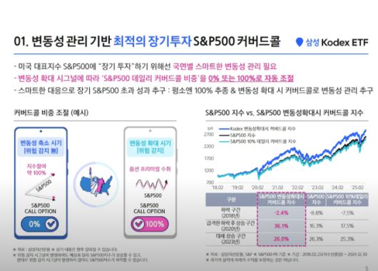 7일 삼성자산운용은 기자 대상 웹 세미나를 열고 오는 12일 ‘KODEX S&P500변동성확대커버드콜’ ETF를 출시한다고 밝혔다. ‘조건부 커버드콜’ 전략을 채택한 해당 ETF는 변동성 확대 국면에서 콜 옵션 매도 비중을 최대 100%로 가져가며 재원을 확보한 뒤 재투자하는 방식으로 운용된다. 안정적인 구간에서는 콜 옵션 매도를 중단하고 S&P500 지수 상승을 100% 추종한다.