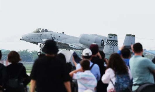 경기 평택시 주한미공군 오산기지에서 열린 ‘오산 에어 파워 데이 2025’에서 A-10 공격기가 시범비행을 하고 있다. 연합뉴스 |
