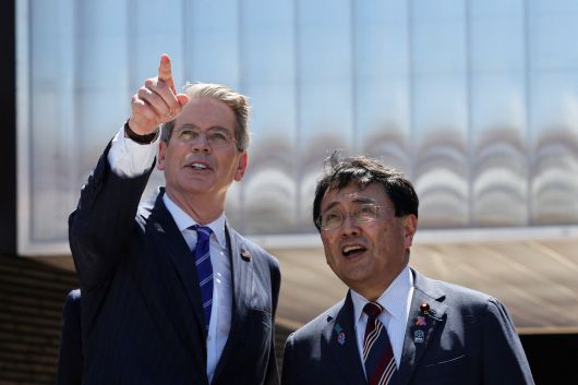 아카자와 료헤이 일본 경제재생상이 스콧 베선트 미 재무장관과 지난달 19일 일본 오사카 엑스포에 참석해 둘러보고 있다. [로이터] |