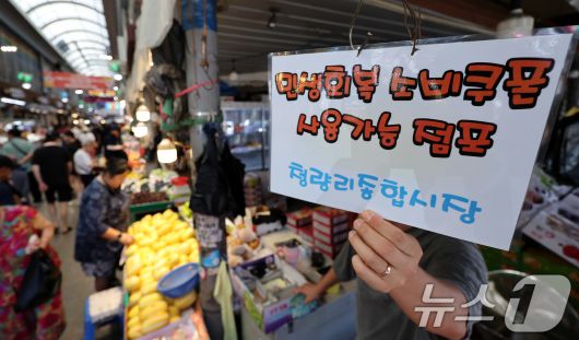 민생회복 소비쿠폰 지급 이후 첫 주말인 27일 서울 동대문구 청량리종합시장의 한 점포에 민생회복 소비쿠폰 사용가능 점포 안내문이 붙어 있다. 2025.7.27/뉴스1 ⓒ News1 박지혜 기자 |