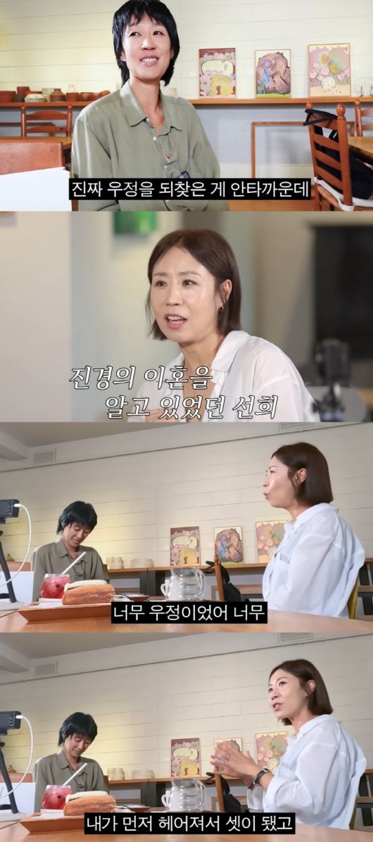 정선희는 홍진경의 전남편과 친구라고. 정선희는 "내가 그걸 수개월 전에 듣고 번호를 지워 말아? 했다. 그래서 아직 있다. 연락을 하진 않는다. 내가 전화해서 그런 건 좀 어색해"라 했고 홍진경은 "셋이 소주 한 잔 하자. 예전처럼"이라고 쿨하게 말했다.