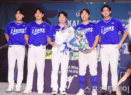 이날 오승환이 은퇴 기자회견에서 원태인, 김재윤, 강민호, 구자욱이 참석해 기념촬영을 하고 있다.