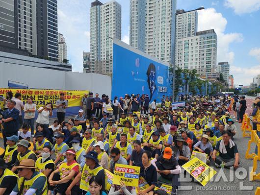▲7일 경기도교육청 앞에서 경기도교육청의 ‘학교급식 식재료 구매방식 업무처리 개선’을 규탄하는 집회가 열리고 있는 모습. ⓒ프레시안(전승표) |