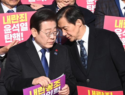 아시아투데이 송의주 기자 = 이재명 더불어민주당 대표가 조국 조국혁신당 대표와 6일 국회 본관 앞 계단에서 열린 내란 동조 국민의힘 규탄 및 탄핵소추안 가결 촉구 제 시민사회 및 야당 공동기자회견에서 대화를 하고 있다. |