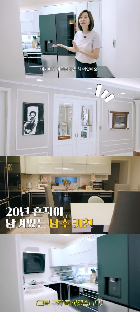 이날 김남주는 “제가 20년 동안 아이들을 키우고, 남편과 알콩달콩 남매를 길러낸 부엌을 보여드리겠다”고 말했다. 공개된 주방은 거울이 붙어있어 내부가 들여다 보이지 않는 미닫이 문으로 완전히 분리돼 있었다.