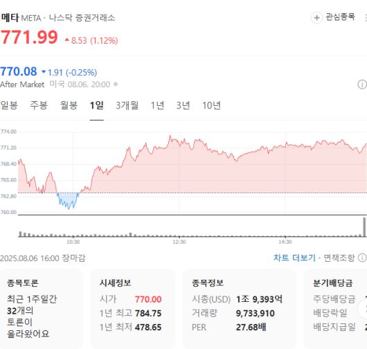 메타의 주가는 7일 770.00달러에서 시작하여 장중 최고 773.64달러까지 상승하며 강세를 이어갔다. 장중 최저가는 760.46달러였다.