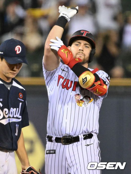 [OSEN=잠실, 조은정 기자]5일 오후 서울 잠실구장에서 ‘2025 신한 SOL Bank KBO리그’ LG 트윈스와 두산 베어스의 경기가 열렸다.LG는 손주영, 두산은 최승용을 선발로 내세웠다.5회말 1사에서 LG 오스틴이 안타를 날린 후 좌익수 포구실책을 틈타 2루를 밟으며 세리머니를 하고 있다. 2025.08.05 /cej@osen.co.kr