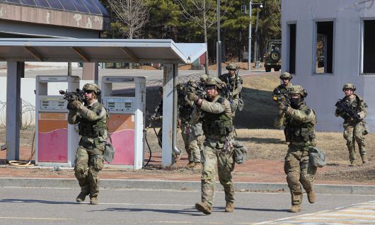 3월 19일 경기도 파주시에서 실시된 한미연합연습 '자유의 방패'(FS·Freedom Shield) 도시지역작전 훈련에서 주한미군 장병이 돌격하고 있다. 연합뉴스 |