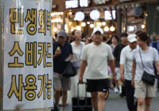 민생회복 소비쿠폰 사용 가능 안내문 붙은 서울 동대문구 청량리종합시장 모습. 연합뉴스 |