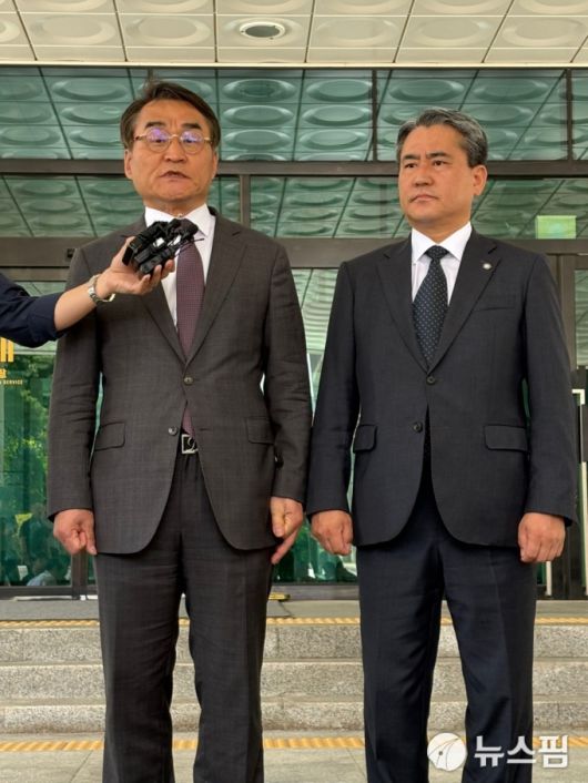 윤석열 전 대통령 법률대리인단인 배보윤(왼쪽) 변호사와 송진호 변호사가 7일 서울고검 청사 앞에서 기자회견을 하고 있다. [서울=뉴스핌] 김현구 기자 = 2025.08.07 hyun9@newspim.com |