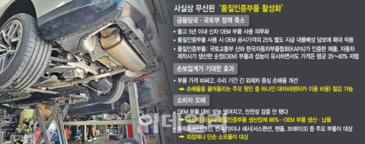 당국은 ‘최소 비용 원칙’에 따라 보험금 지급 기준을 마련할 예정이었고, 대차비와 부품비 등을 종합적으로 고려할 계획이었다. 또 소비자들의 오해와는 달리, 국산차 외장재 품질인증부품 생산업체의 86%는 OEM 부품도 함께 생산·납품하고 있다. 자동차 충격 실험 결과에선 품질인증부품이 오히려 OEM 부품보다 상해 위험이 낮다는 연구 결과도 있다.