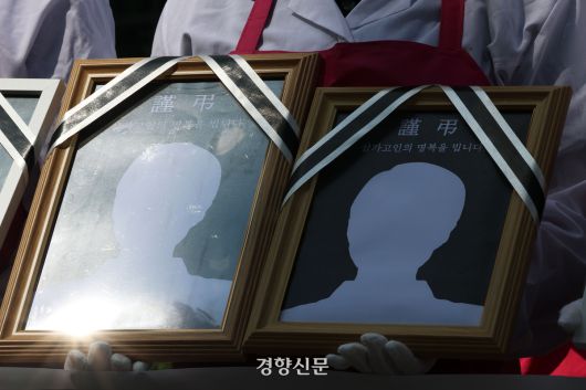 이날 참석자들은 14개의 영정을 들고 기자회견을 진행했다. 폐암 확진을 받은 노동자도 참석했다. 그는 “20여 년 동안 급식실에서 일했지만 남은 건 병든 몸뿐”이라며 “산재신청에 대한 답변도 듣지 못한 상태”라고 호소했다.