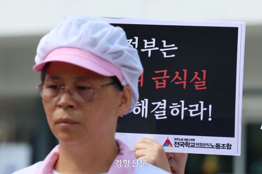 민주노총 서비스연맹 전국학교비정규직노동조합 소속 조합원과 급식노동자들이 7일 서울 종로구 국정기획위원회 앞에서 기자회견을 열고 폐암 산재 사망 대책을 촉구했다. 이들은 같은 날 국정기획위원회와 간담회를 갖고 환기 시설 개선, 인력 충원, 학교급식법 개정 등을 요구했다.