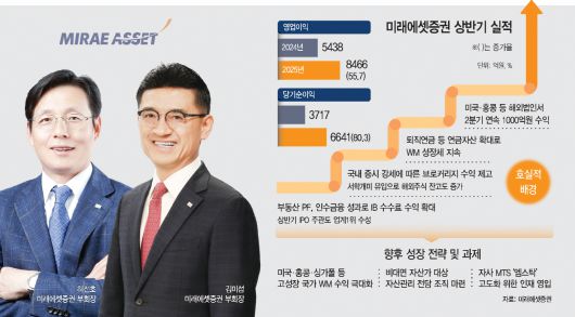 미래에셋증권이 해외법인 실적과 함께 주식시장 호황 등으로 올 상반기 영업이익이 크게 늘었다. 세전이익으로는 최초로 5000억원을 돌파하며 올 해 '1조 클럽' 달성도 무난할 것으로 전망된다. 특히 올 초 김미섭 부회장과 허선호 부회장은 글로벌과 WM(자산관리), 연금을 통해 수익을 증대하겠다고 선언했는데, 실제 올 상반기 수익에서 세 부문 모두 고른 성과를 냈다. 다만, 해외법인 중 인도 쉐어칸은 아직 인수합병 후 작업이 진행 중인만큼 실적 기여도가 낮다. 미래에셋증권은 인도 현지에서도 종합증권사로 발돋움할 수 있도록 시도하고 있다면서 조만간 해외법인 수익이 더욱 늘어날 것이라고 설명했다. 이 외에 미래에셋증권은 올 해 자사 MTS(모바일트레이딩시스템)인 '엠스탁'을 전 세계 고객들이 다양한 금융 업무에도 사용할 수 있도록 하기 위한 작업에 돌입한다. 이를 위해 IT관련 인재 영입에 나설 계획인데, 이들 대상으로 파격적인 스톡옵션도 주겠다는 방침이다.