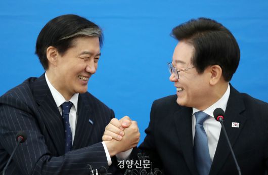지난해 8월21일 당시 이재명 더불어민주당 대표(오른쪽)와 조국 조국혁신당 대표가 국회 혁신당 대표실에서 만나 웃으며 손을 잡고 있다. 박민규 선임기자 |