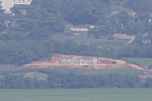 경기도 파주시 오두산 통일전망대에서 바라본 북한 황해북도 개풍군에서 북한 주민들이 건축 작업을 하고 있다. [사진=연합뉴스] |