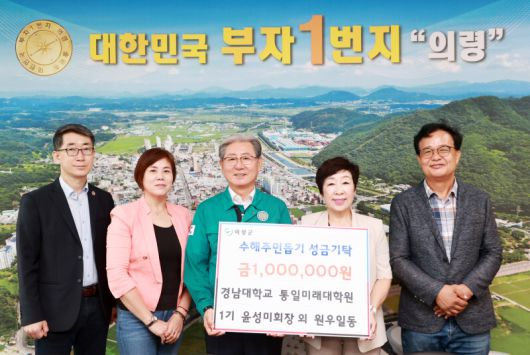경남대학교 북한대학원대학교 통일미래최고위과정 제1기 동기회(회장 윤성미) 원우들이 최근 집중호우로 큰 피해를 입은 의령군 주민들을 돕기 위해 수해 복구 성금 100만원을 기탁했다.