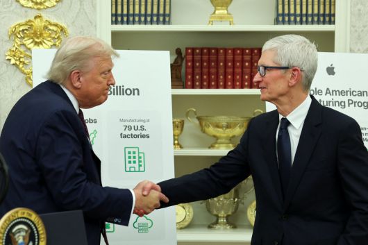 애플은 이날 미국 정부의 관세 부과 위협에 맞서 1000억달러(약 138조원) 추가 투자를 발표했다. 향후 4년간 애플이 미국 내에 투자할 금액은 총 6000억달러(약 830조원)로 늘었다.