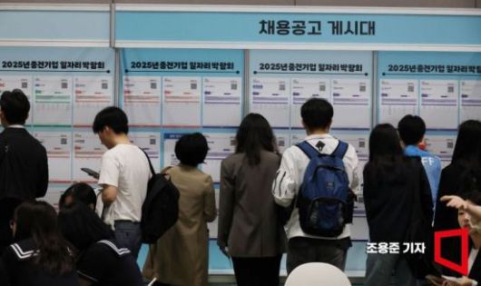 지난 4월 23일 서울 강남구 코엑스에서 열린 2025년 중견기업 일자리 박람회를 찾은 많은 구직자들이 채용공고 게시판을 살펴보고 있다. |