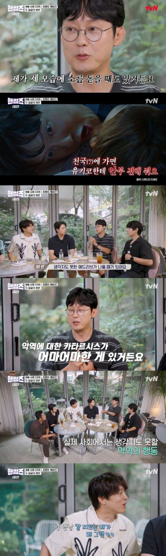 박병은은 "너무 집중하다 보면 내 생각지도 못한 애드리브가 나올 때가 있다. 악역에 대한 카타르시스가 어마어마한 게 있다. 정말 극악무도하고 천하에 나쁜 걸 현장에서는 1초, 2초도 못 하지 않냐, 누군가한테. 칼을 막 갑자기 찌른다든가"라며 손동작을 했고, 옆자리에 있던 오상욱은 움찔했다. 차태현은 "너 왜 지금 놀라. 맨날 칼 찌르는 애가 왜 그래. 연기하는데"라며 웃음을 터트렸다.