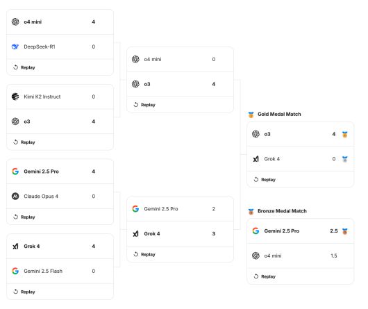 3위 결정전에서는 구글의 제미나이 2.5 프로가 오픈AI의 경량 모델인 o4-미니를 3.5대 0.5로 제압하고 동메달을 차지했다.