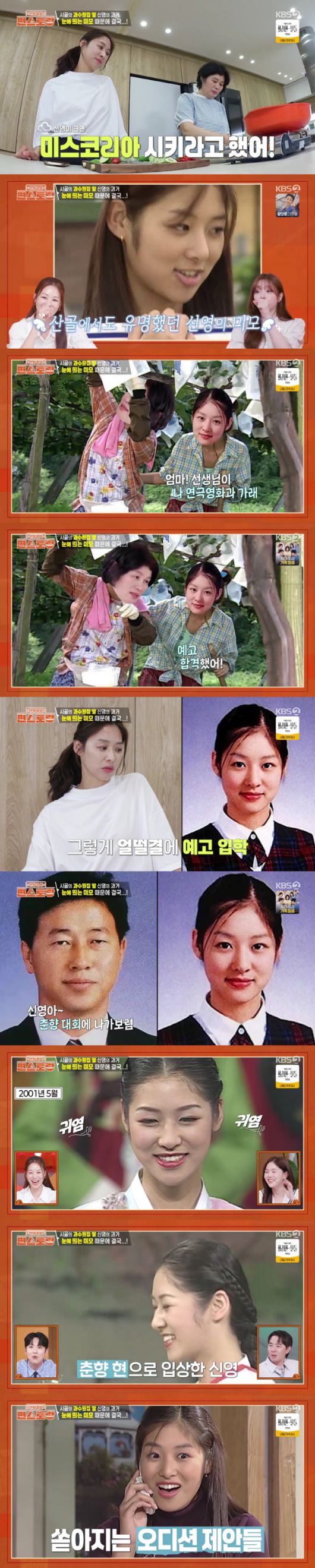 장신영의 친정엄마는 "옛날에 우리집이 포도 과수원을 했다"라며 "동네 사람들이 신영이 보고, 딸내미 크면 크면 미스코리아 내보내라고 했다"라고 딸의 어린 시절 외모를 자랑했다.