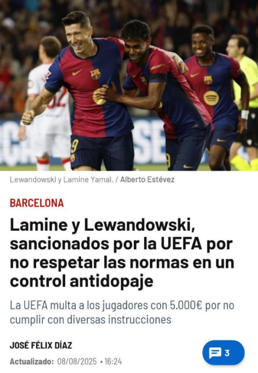 스페인 유력지 '마르카'는 8일(한국시간) "바르셀로나 슈퍼스타 야말과 레반도프스키가 UEFA 반도핑 규정을 위반한 혐의로 5000유로의 벌금을 부과받았다. 지난 시즌 마지막 유럽대항전 일정에서 반도핑 관리관 지시에 따르지 않았고 절차에 따라 관리소에도 보고하지 않은 혐의가 인정됐다"고 적었다.
