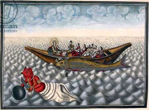인류 문명의 뿌리인 신화는 삶의 지혜를 담고 있다. 인도 홍수 신화의 한 장면으로 거대한 물고기로 변한 신이 배를 이끌고 있다. 출처 위키미디어 |
