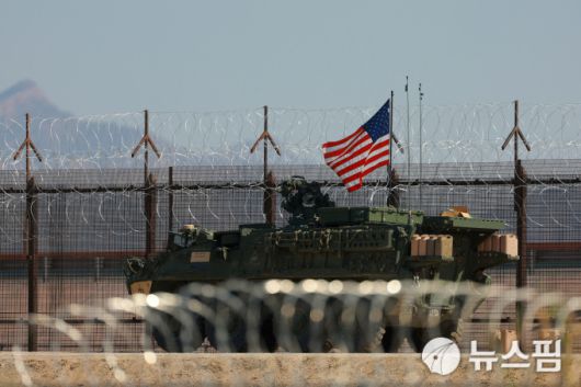 트럼프 행정부의 이민 단속의 일환으로 그리고 뉴멕시코와 텍사스에 걸쳐 미국 남부 국경을 따라 260마일의 군사 구역이 설정된 후, 미 육군 스트라이커 장갑차가 미국-멕시코 국경을 경비하고 있다.[사진=로이터 뉴스핌] |