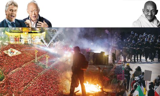 도널드 트럼프 미국 대통령의 ‘반이민주의’ 등 최근 전 세계가 집단 갈등과 대립을 겪으며 그 원인으로 ‘부족주의’가 지목되고 있지만, 부족주의는 오히려 화해와 협력, 공동의 문제 해결 열쇠로 작용할 수 있다. 사진은 2002년 한·일 월드컵 당시 서울 시청 광장을 가득 메운 대한민국 응원단 모습과 지난 6월 8일 미국 캘리포니아주 로스앤젤레스 도심에서 연방 이민 정책에 항의하는 시위대가 경찰과 대치하고 있는 모습. 인물 사진은 왼쪽부터 부족주의로 긍정적인 결과를 이끌어낸 거스 히딩크 감독과 리콴유 전 싱가포르 총리, 인도의 정신적 지주인 마하트마 간디. 세계일보 자료 사진 |
