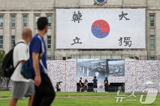 8일 오후 서울 중구 서울도서관 앞에 광복 80주년을 맞아 설치된 '태극기 언덕' 앞으로 시민들이 오가고 있다. 2025.8.8/뉴스1 ⓒ News1 민경석 기자 |