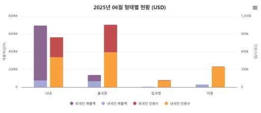 시내면세점, 입출국장 면세점 등 면세점 형태별 외국인 매출액 현황. |